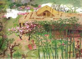请看:田野里有庄稼,有桑园,有竹林,水池里有鱼虾等水产品;鸡鸣狗叫,万物欢腾;老人小孩一个个都乐陶陶的。