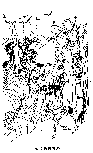 再看他用字:“枯,老,昏,古,瘦,下一字便觉愁重十分,成一句已经不能自己。至于成篇可让人泣不成声也。最绝处在马之前下一‘瘦’字,妙在欲写人之瘦而偏不写人,由写马之瘦而衬出其人之瘦,其人之清贫。路途跋涉之艰辛。求功名之困苦。让人读之而倍感其苦,咏之而更感其心。读此曲而不泪下者不明其意也。