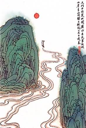 “两岸青山相对出,孤帆一片日边来。”这两句是一个不可分割的整体。上句写望中所见天门两山的雄姿,下句则点醒“望”的立脚点和表现诗人的淋漓兴会。诗人并不是站在岸上的某一个地方遥望天门山,他“望”的立脚点便是从“日边来”的“一片孤帆”。读这首诗的人大都赞赏“两岸青山相对出”的“出”字,因为它使本来静止不动的山带上了动态美,但却很少去考虑诗人何以有“相对出”的感受。如果是站在岸上某个固定的立脚点“望天门山”,那大概只会产生“两岸青山相对立”的静态感。反之,舟行江上,顺流而下,望着远处的天门两山扑进眼帘,显现出愈来愈清晰的身姿时,“两岸青山相对出”的感受就非常突出了。“出”字不但逼真地表现了在舟行过程中“望天门山”时天门山特有的姿态,而且寓含了舟中人的新鲜喜悦之感。夹江对峙的天门山,似乎正迎面向自己走来,表示它对江上来客的欢迎。