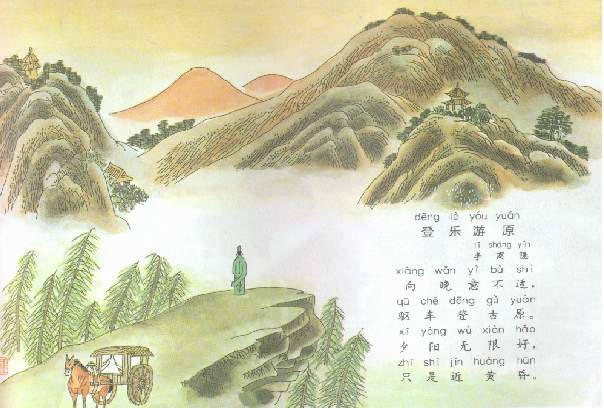 玉谿诗人,另有一首七言绝句,写道是:“万树鸣蝉隔断虹,乐游原上有西风,羲和自趁虞泉〔渊〕宿,不放斜阳更向东!”那也是登上古原,触景萦怀,抒写情志之作。看来,乐游原是他素所深喜、不时来赏之地。这一天的傍晚,不知由于何故,玉谿意绪不佳,难以排遣,他就又决意游观消散,命驾驱车,前往乐游原而去。
